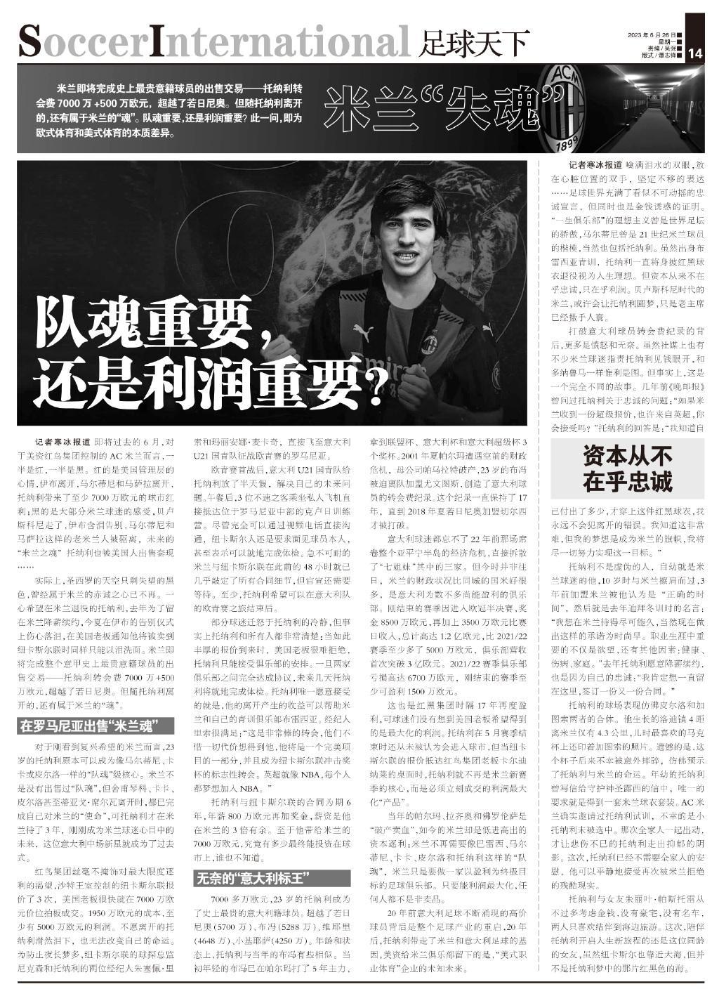 【米蘭失魂】米蘭即將完成史上最貴意籍球員的出售交易——託納利轉會費7000萬+500萬歐元,超越了若日尼奧。但隨託納利離開的,還有屬於米蘭的“魂”。隊魂重要,還是利潤重要?此一問,即爲歐式體育和美式體育的本質差異。