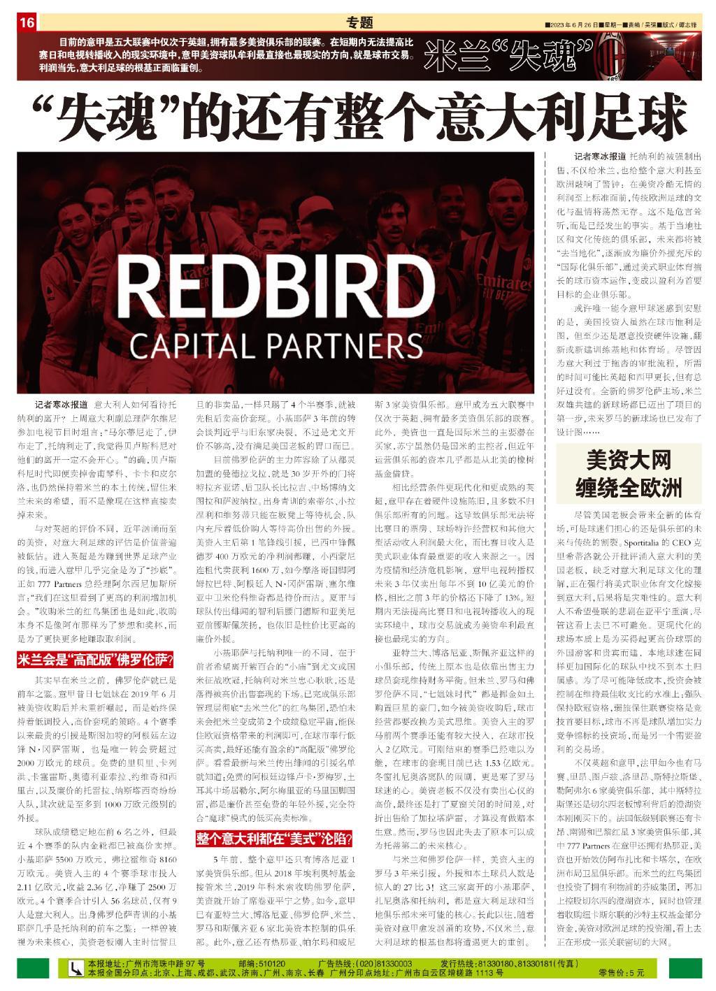 【米蘭失魂】目前的意甲是五大聯賽中僅次於英超,擁有最多美資俱樂部的聯賽。在短期內無法提高比賽日和電視轉播收入的現實環境中,意甲美資球隊牟利最直接也最現實的方向,就是球市交易。利潤當先,意大利足球的根基正面臨重創。