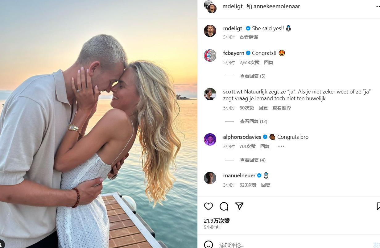 北京時間6月30日,23歲的拜仁中衛德里赫特宣佈向女友求婚成功。