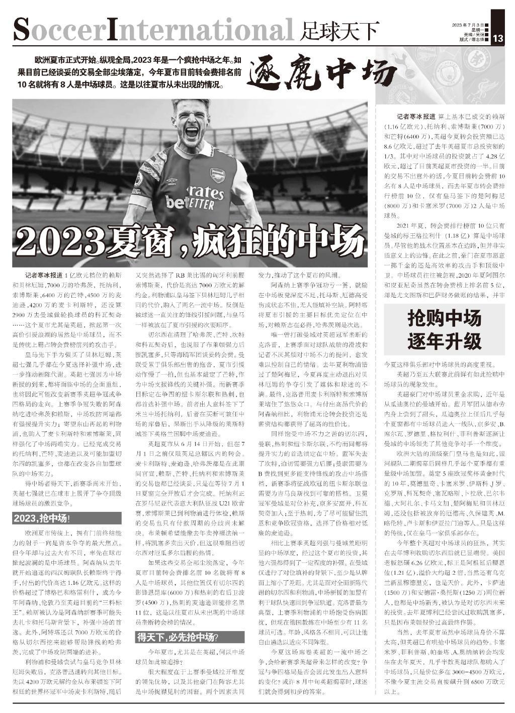 【逐鹿中場】歐洲夏市正式開始。縱觀全局,2023年是一個瘋搶中場之年。如果目前已經談妥的交易全部塵埃落定,今年夏市目前轉會費排名前10名就將有8人是中場球員。這是以往夏市從未出現的情況。