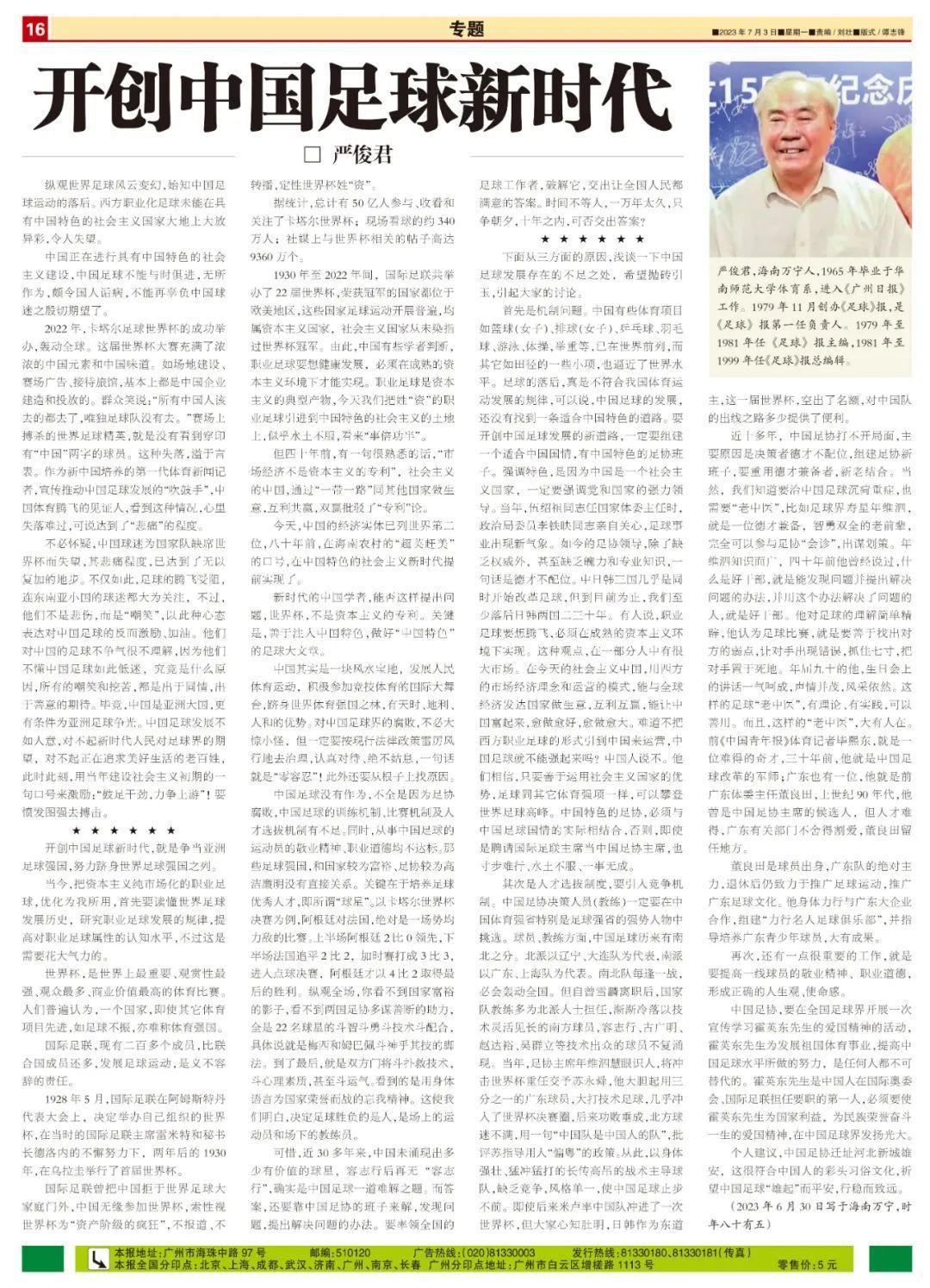 編者按:他是《足球》報創始人,他是從業超過40年的中國足球報道者,他見證並記錄了中國足球過去半個世紀的崢嶸歲月,他是嚴俊君!雖然已年過八旬,但他依舊熱切關注中國足球發展,在中國足球經歷新一輪反腐打假整肅之後,嚴老在老家海南萬寧寫下了這篇《開創中國足球新時代》,這是他對中國足球的深刻思考。