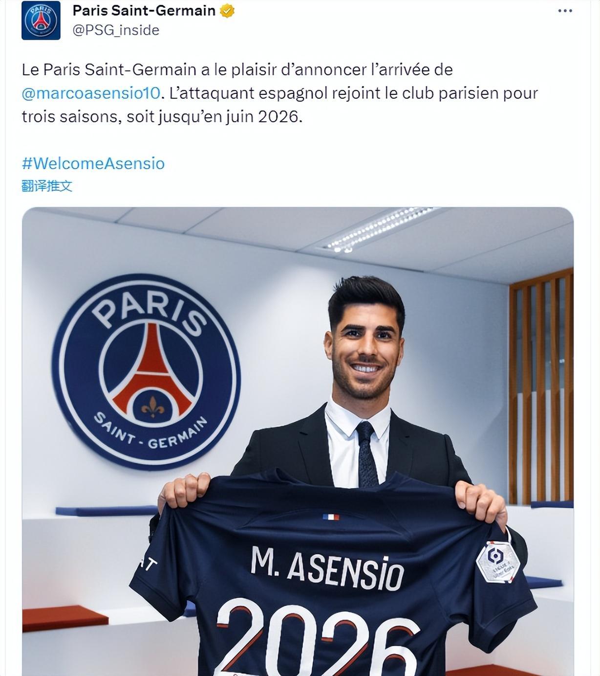 在官宣跟28歲的國米中衛什克里尼亞爾簽約5年後,他們又跟27歲的皇馬前鋒阿森西奧簽約三年。他們兩人在德國轉會市場上的身價總值爲7500萬歐元。雖然巴黎不用支付轉會費,但據瞭解他們分別給什克和阿森西奧總值3500萬歐元的簽字費,而且每人都可以獲得一份年薪1000萬歐元的肥約。