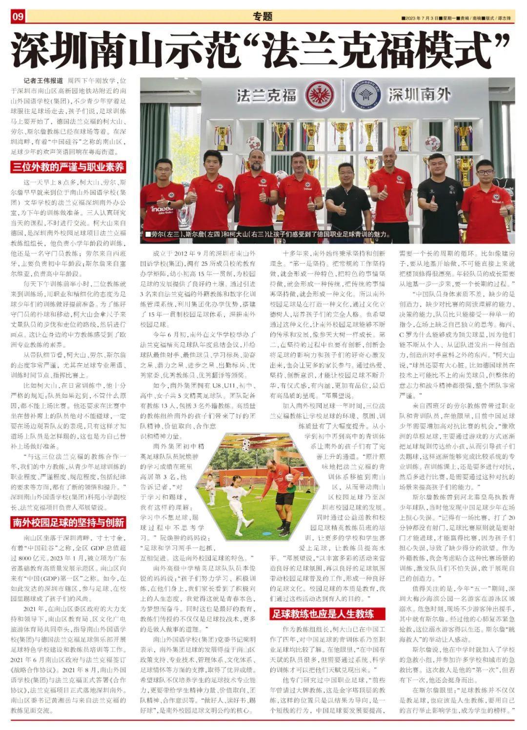 記者王偉報道 週四下午剛放學,位於深圳市南山區高新園地鐵站附近的南山外國語學校(集團),不少青少年穿着足球服往足球場走去,孩子們說,足球訓練馬上要開始了,德國法蘭克福的柯大山、勞爾、斯爾詹教練已經在球場等着。在深圳灣畔,有着“中國硅谷”之稱的南山區,足球少年的歡聲笑語迴響在粵海街道。