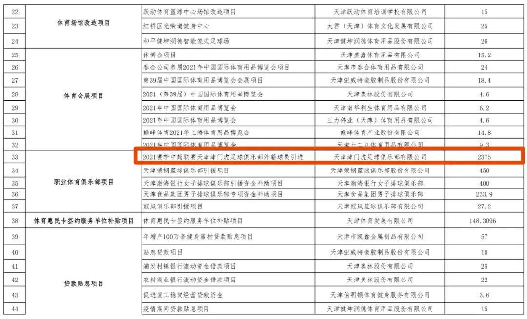 到了今年,主客場制恢復之後,政府的重視程度也再度提升。今年3月,天津市體育局網站公開信息,發佈了“關於2023年天津市體育產業發展專項資金擬資助項目情況的公示”,其中包括天津津門虎俱樂部申報的“2023賽季中超聯賽外籍球員引進”項目。本次公示文件中顯示,天津津門虎擬獲補助資金2375萬元,是公示46個項目裏最高的;其次是天津榮鋼籃球俱樂部450萬、渤海銀行女子排球俱樂部400萬。