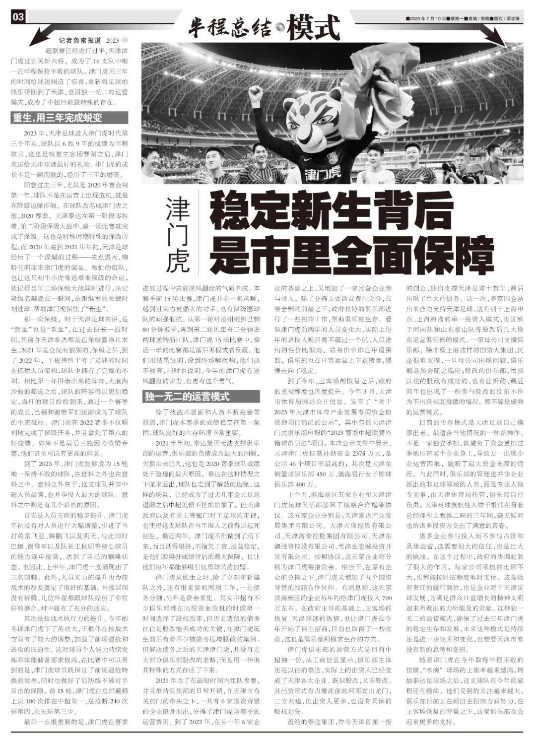 2023年,天津足球進入津門虎時代第三個年頭,球隊以6勝9平的成績爲半程收官,這也是恢復主客場賽制之後,津門虎送給天津球迷最好的禮物。津門虎的成長不是一蹴而就的,經歷了三年的磨礪。