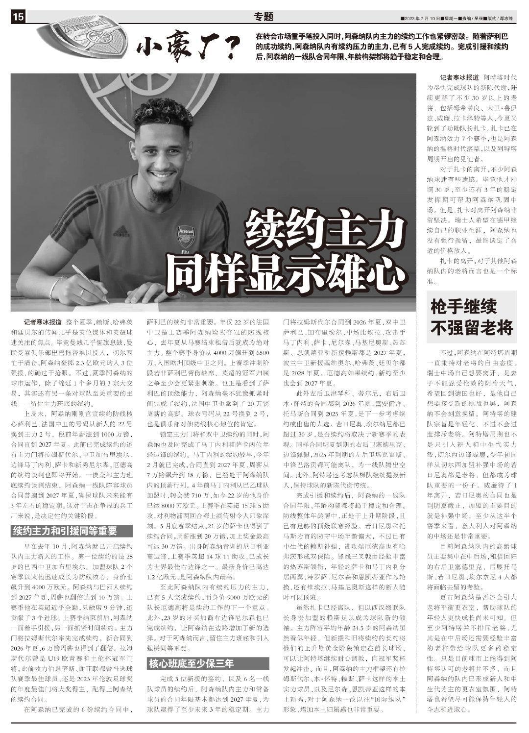 上週末,阿森納剛剛官宣續約防線核心薩利巴,法國中衛的號碼從新人的22號換到主力2號,稅前年薪漲到1000萬鎊,合同直到2027年夏。此前已完成續約的還有主力門將拉姆斯代爾、中衛加布裏埃爾、邊鋒馬丁內利、薩卡和新秀尼爾森,厄德高的續約談判也即將開始。一俟全部主力班底續約談判結束,阿森納一線隊陣容球員的合同普遍將持續到2027年夏,確保球隊未來能有3年左右的穩定期。這對於志在爭冠的兵工廠來說,是決定性的關鍵階段。