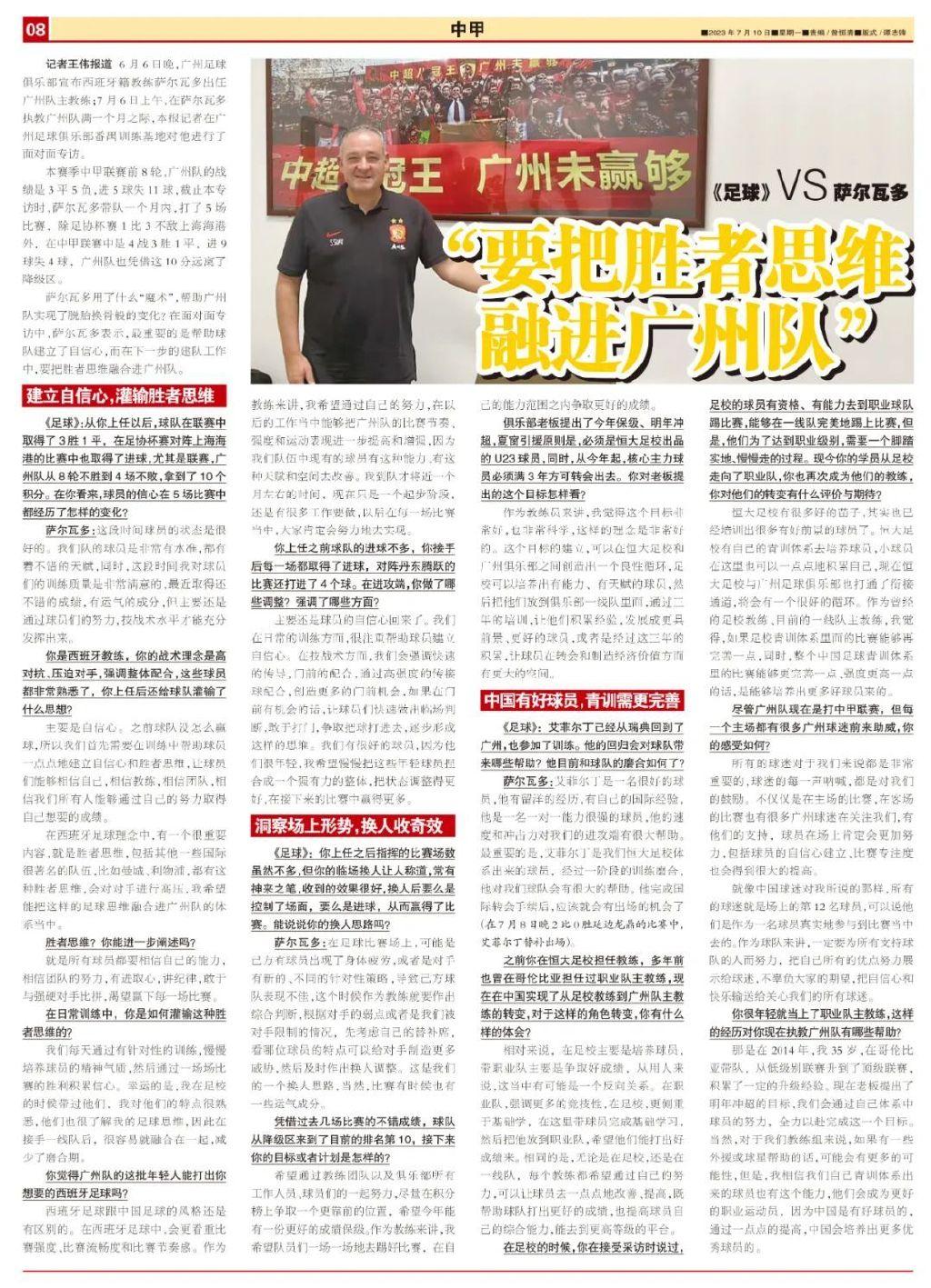 記者王偉、實習記者鄭耀林報道 6月6日晚,廣州足球俱樂部宣佈西班牙籍教練薩爾瓦多出任廣州隊主教練;7月6日上午,在薩爾瓦多執教廣州隊滿一個月之際,本報記者在廣州足球俱樂部番禺訓練基地對他進行了面對面專訪。