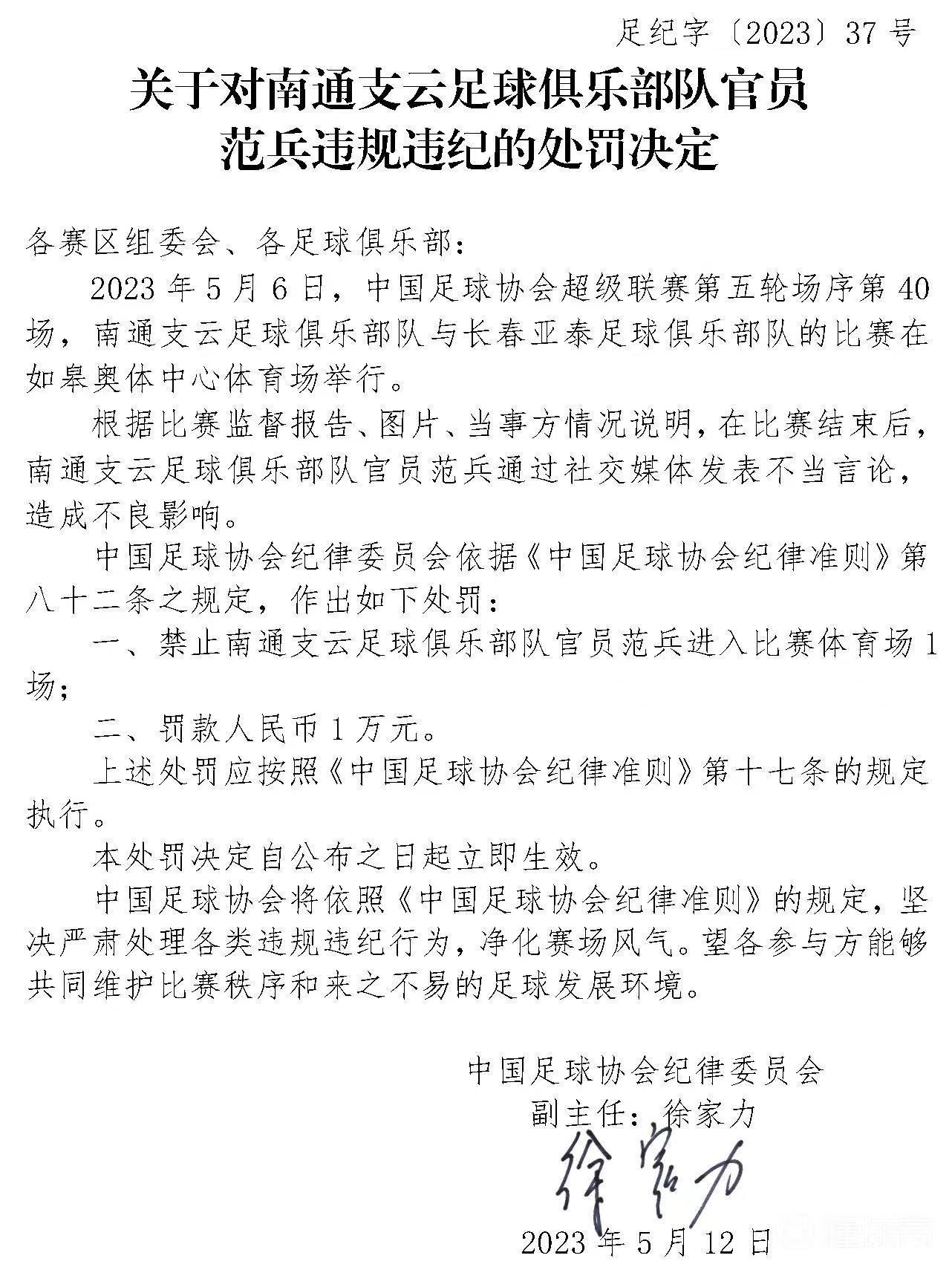 這並不是範兵首次公開發布聲明表達對足協的不滿,在本賽季第五輪南通與亞泰的賽後,他在朋友圈發文質疑裁判水平,並認爲VAR只是個擺設。之後被足協罰款1萬,禁入球場1場。