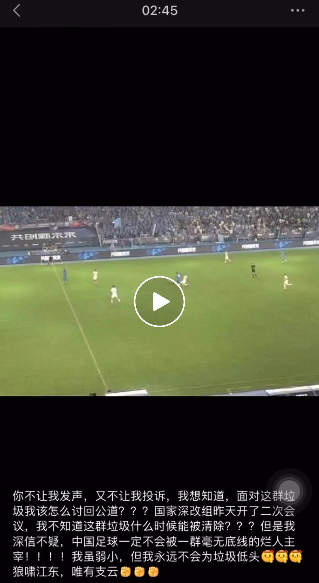 “你不讓我發聲,又不讓我投訴,我想知道,面對這羣垃圾我該怎麼討回公道???國家深改組昨天開了二次會議,我不知道這羣垃圾什麼時候能被清除???但是我深信不疑,中國足球一定不會被一羣毫無底線的爛人主宰!!!我雖弱小,但我永遠不會爲垃圾低頭。狼嘯江東,唯有支雲。”