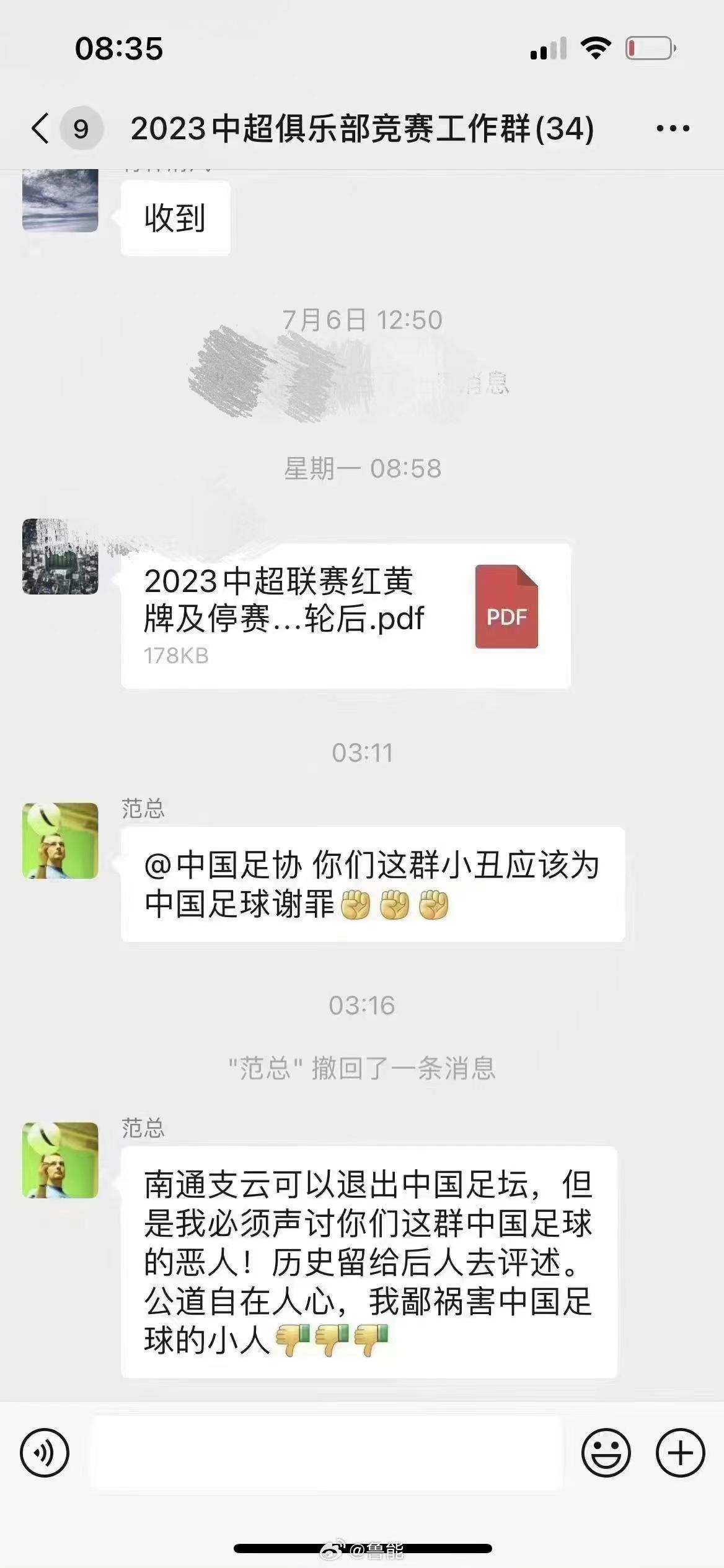 隨後,範兵更是在中超俱樂部競賽工作羣中發聲:“@中國足協,你們這羣小丑應該爲中國足球謝罪,南通支雲可以退出中國足壇,但是我必須聲討你們這羣中國足球的惡人!歷史留給後人去評述,公道自在人心,我鄙禍害中國足球的小人。”