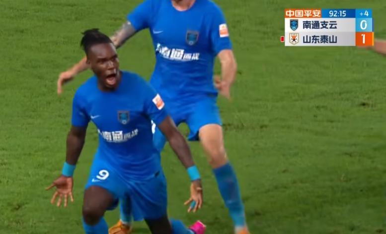 第93分鐘,馬晟頭球往門裏頂,卡斯蒂略頭球接力破門,南通支雲扳平1-1。