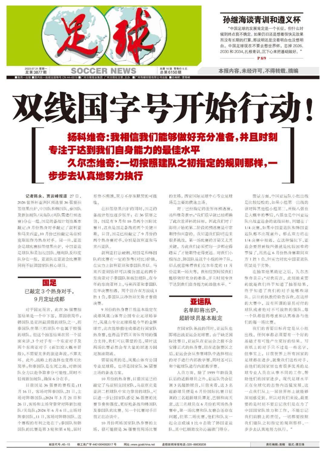 記者陳永、賈巖峯報道 7月27日,2026世界盃亞洲區預選賽36強賽抽籤結果出爐,中國隊和韓國隊、泰國隊及新加坡隊/關島隊(兩隊需進行預選賽)分在一組。國足的備戰計劃也基本敲定:9月份熱身對手敲定了敘利亞和馬來西亞,10月份已經敲定烏茲別克斯坦作爲熱身對手。同一日,亞運會足球比賽抽籤結果出爐,中國亞運足球隊和孟加拉國隊、緬甸隊及印度隊分在一組,亞運隊在亞運會比賽期間將不徵調國家隊核心球員。
