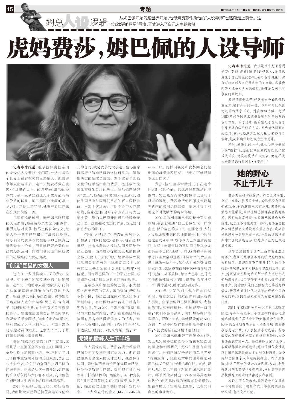 2021年夏姆巴佩出爾反爾拒絕皇馬,轉而接受大巴黎總價值高達6.3億歐元的合同,就是費莎的大手筆。皇馬主席佩雷斯相信姆巴佩始終認可皇馬,但作出決定的是球員母親。左手紋着卡比勒文化傳統手鍊圖案的費莎,迅速成爲法國體育媒體關注的焦點。隨後姆巴佩帶頭“罷工”,拒絕出席法國隊商業活動,迫使法國足協與國腳們重新簽署肖像權協議。再加上這次公開聲明不會與大巴黎續約,接受《法國足球》專訪公開與大巴黎決裂,哪怕大巴黎開出最後通牒也無動於衷。這些強勢表態的背後,毫無疑問都有費莎的影子。
