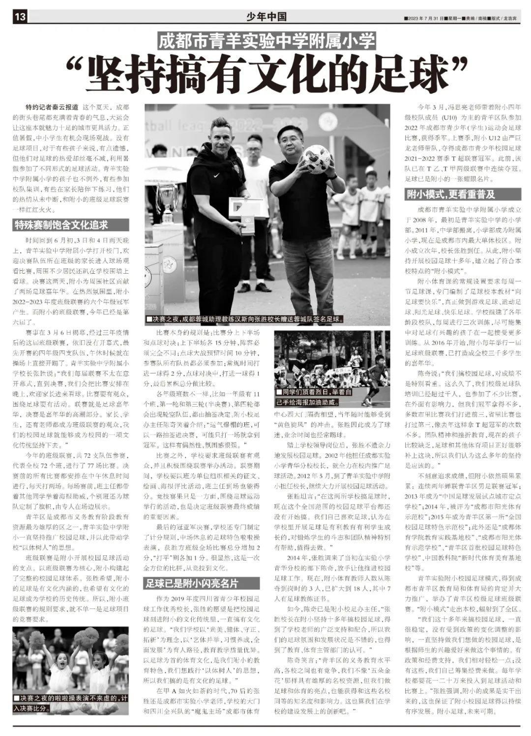 陳奇笑言:“青羊區的義務教育水平高,各校之間也有競爭,我們不像‘五朵金花’那樣具有雄厚的名校資源,但我們做足球和體育的亮點,也能獲得和這些名校同等的知名度和影響力。這也算我們在學校的建設發展上的創新吧。”