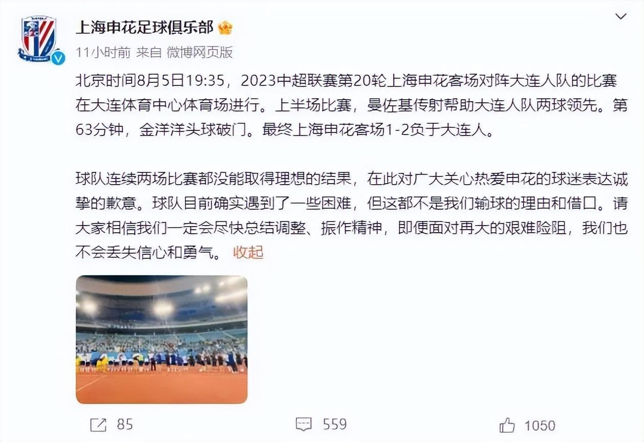 俱樂部官方表示:“球隊連續兩場比賽都沒能取得理想的結果,在此對廣大關心熱愛申花的球迷表達誠摯的歉意。球隊目前確實遇到了一些困難,但這都不是我們輸球的理由和藉口。請大家相信我們一定會盡快總結調整、振作精神,即便面對再大的艱難險阻,我們也不會丟失信心和勇氣。”