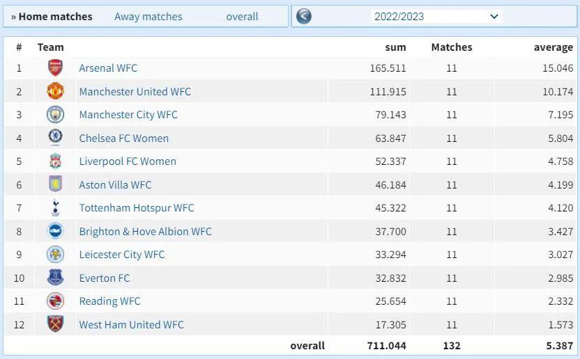 上賽季女足英超聯賽觀衆數是之前賽季的2.8倍,這還是12家女足英超俱樂部的主場被安排在容量較小的球場所致,新賽季女足英超的主場將全部安排在男足英超所在主場,觀衆人數還將進一步飆升。