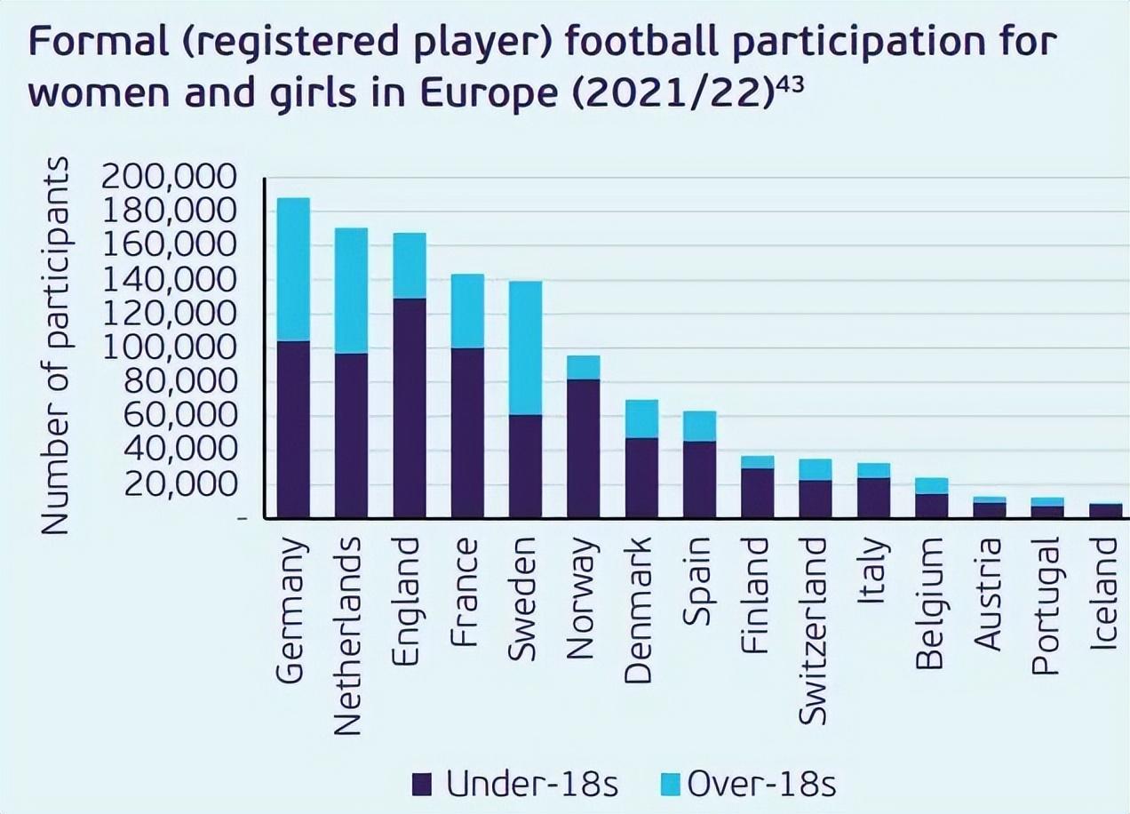 註冊女足人口超過10萬的歐洲足協包括英格蘭、法國、德國、荷蘭、挪威、瑞典、意大利、西班牙,上賽季女足意甲才正式職業化,意大利足協的女足註冊人口就超過了10萬。人口不到600萬的丹麥,註冊女足球員就超過6萬,是中國的4倍!甚至人口只有38萬的冰島,註冊的女足球員人數都接近1萬。佔冰島全國人口的2.7%,相當於中國有4000萬註冊女足球員!而且,傳統上文化保守的土耳其,女足註冊人口也突破了5萬。