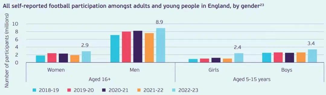 ▲最近5年,英格蘭成年人和青少年參與足球人數變化
