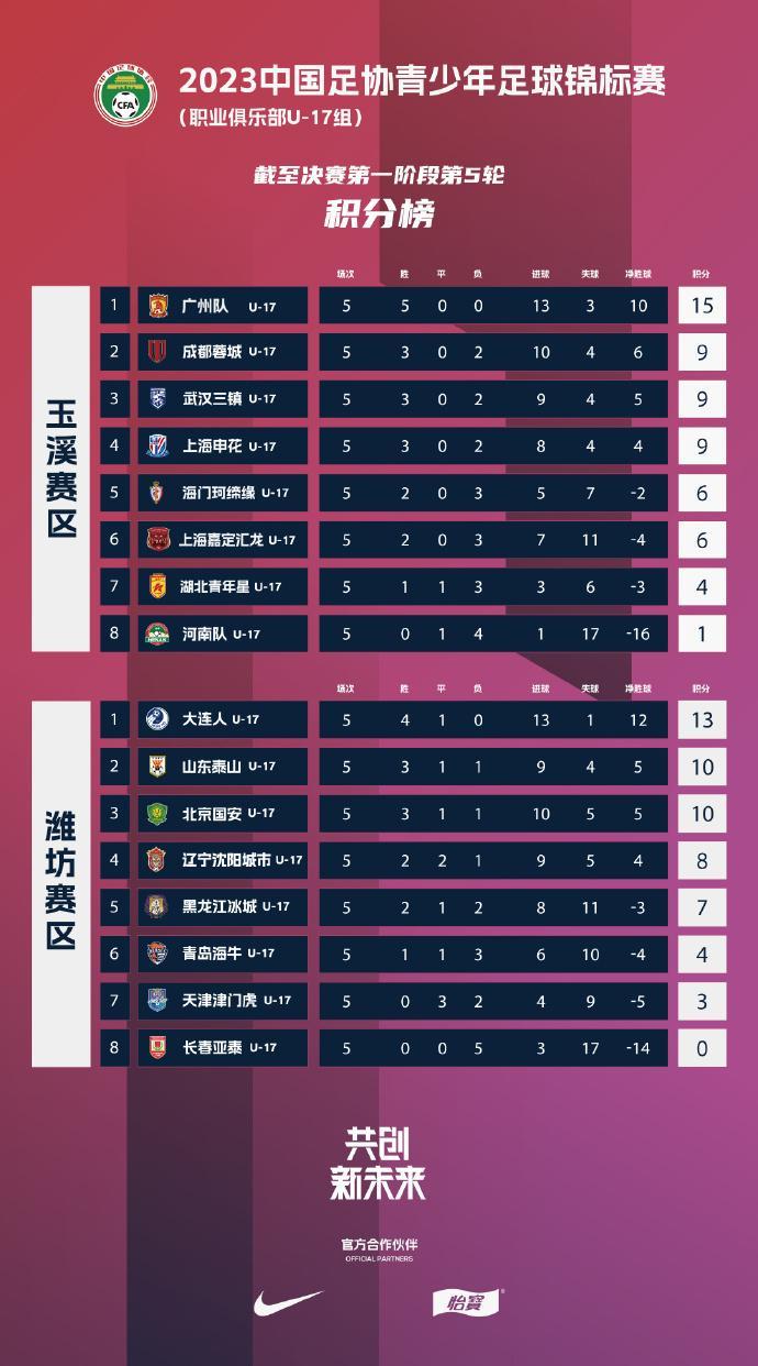 記者陳永報道 8月6日下午,隨着天津津門虎U17隊3比0擊敗北京國安U17隊,2023中國足協青少年足球錦標賽(職業俱樂部U17組,以下簡稱U17聯賽)決賽第一階段落下帷幕,7輪小組單循環賽戰罷,廣州隊和大連人隊分居南北區榜首,攜手其它6支球隊晉級第二階段爭冠組。