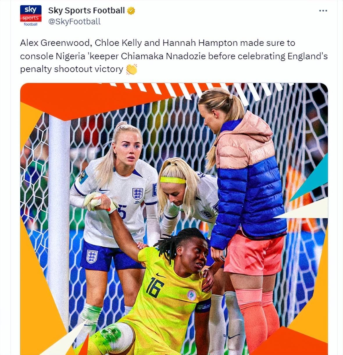 克洛伊·凱利在罰進制勝點球后,英格蘭女足全隊陷入瘋狂慶祝中。她們圍成一圈,彼此擁抱、擊掌,克洛伊·凱利突然發現了什麼,她從突圍而出走向了球門。原來是看到了尼日利亞門將奇亞馬卡·納多齊正倒在草地上,淚水和失落充斥着她的雙眼。