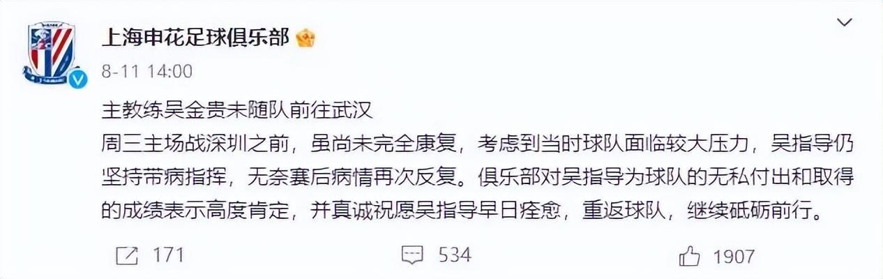 11日下午14點,距申花搭乘的航班起飛前兩個半小時,申花俱樂部官方發佈了吳金貴因身體原因無法隨隊前往武漢的消息。申花在公告中寫道:週三主場戰深圳之前,雖尚未完全康復,考慮到當時球隊面臨較大壓力,吳指導仍堅持帶病指揮,無奈賽後病情再次反覆。俱樂部對吳指導爲球隊的無私付出和取得的成績表示高度肯定,並真誠祝願吳指導早日痊癒,重返球隊,繼續砥礪前行。