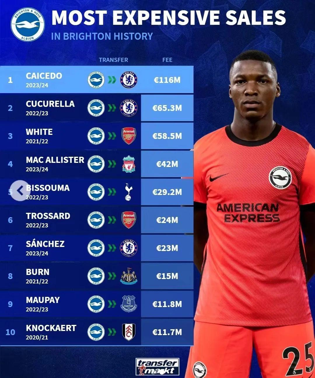 出身布萊頓青訓的“零成本”門將桑切斯和後衛本·懷特,分別讓切爾西掏了2300萬,阿森納掏了5850萬;800萬購入麥卡利斯特,4年後從利物浦淨賺3400萬;1800萬的庫庫雷利亞只用1年,就淨賺4730萬。最誇張是凱塞多,31個月前500萬歐元購入,如今至少淨賺1.11億歐元,最高可達1.28億歐元!而且,這還沒算去年切爾西強挖教練波特支付的2500萬歐元違約金收入。