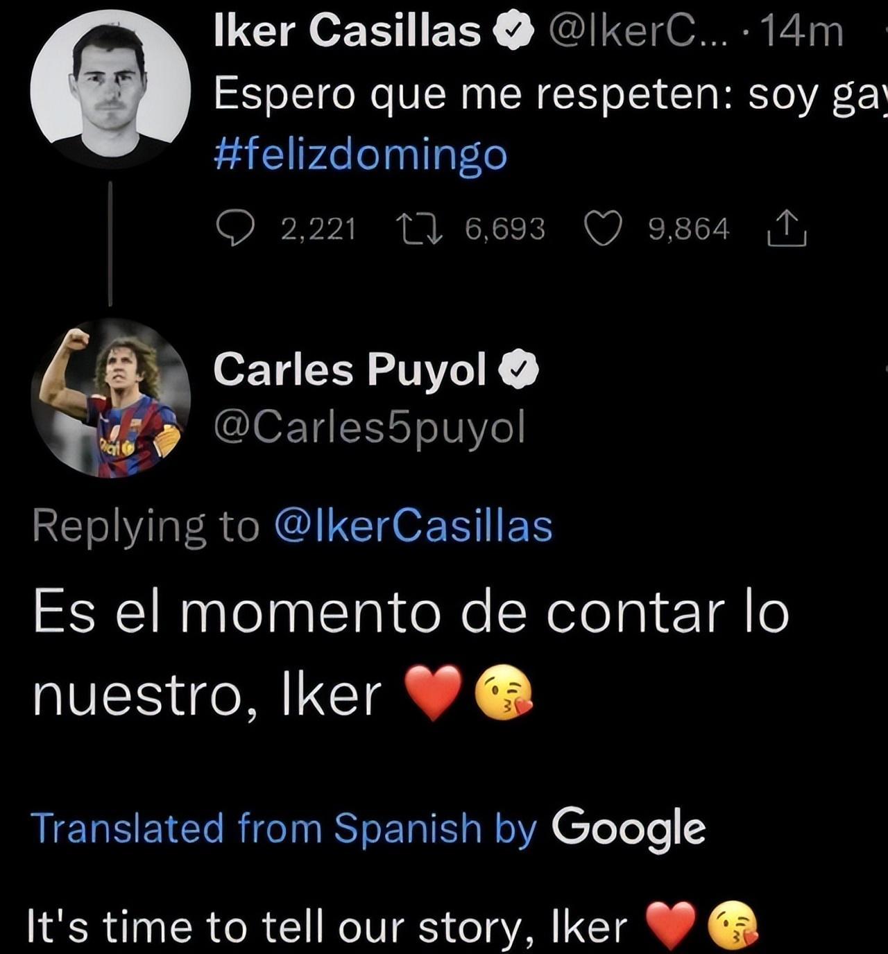 9日,前皇馬、西班牙國家隊傳奇門將卡西公開宣佈出櫃,卡西利亞斯在個人社交媒體表示:我希望你們尊重我,我是一名同性戀。他在國家隊的前隊友、昔日巴薩鐵血隊長普約爾則回應道:“是時候公開我們的故事了,伊克爾。”而在1小時後,卡西更新社媒宣稱,自己的賬號被黑,並非是本人所爲。