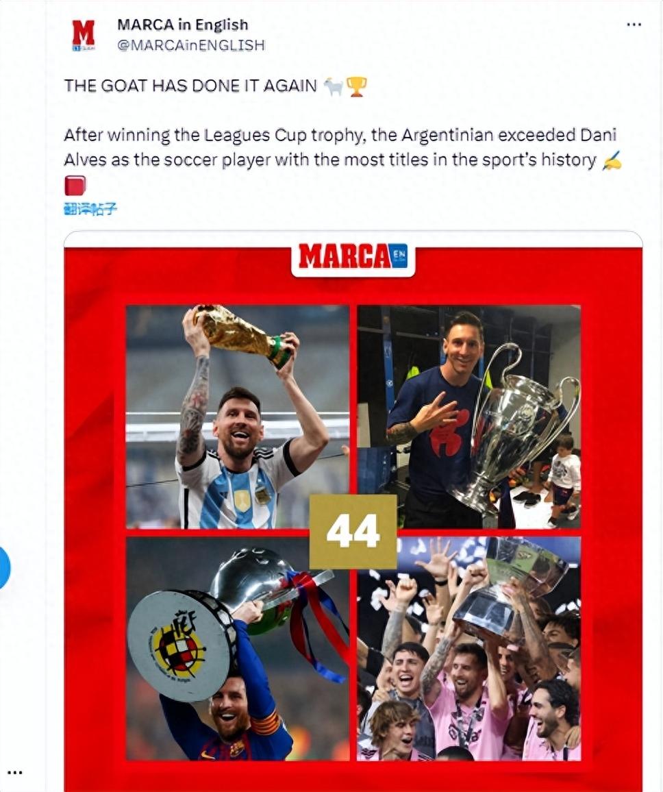 36歲的梅西在這個時刻,再次證明了自己在足球領域的非凡價值。這位世界盃冠軍已經在19年職業生涯中積累了驚人的44個冠軍頭銜,超越了曾經的紀錄保持者阿爾維斯,成爲足壇奪冠最多的球員。