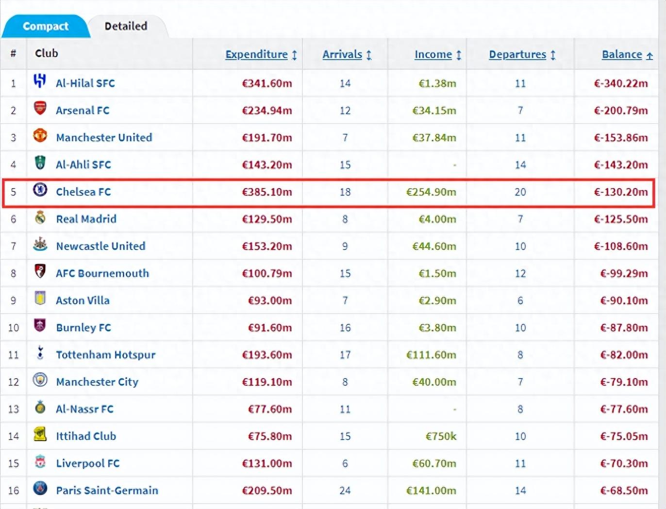當然,如果只算今夏引援花費,切爾西是第一的,他們今夏已經花費了3.85億歐元,但他們通過出售芒特、愛德華·門迪和庫利巴利等球員套現了2.54億歐元,轉會費淨投入只不過是1.3億歐元。