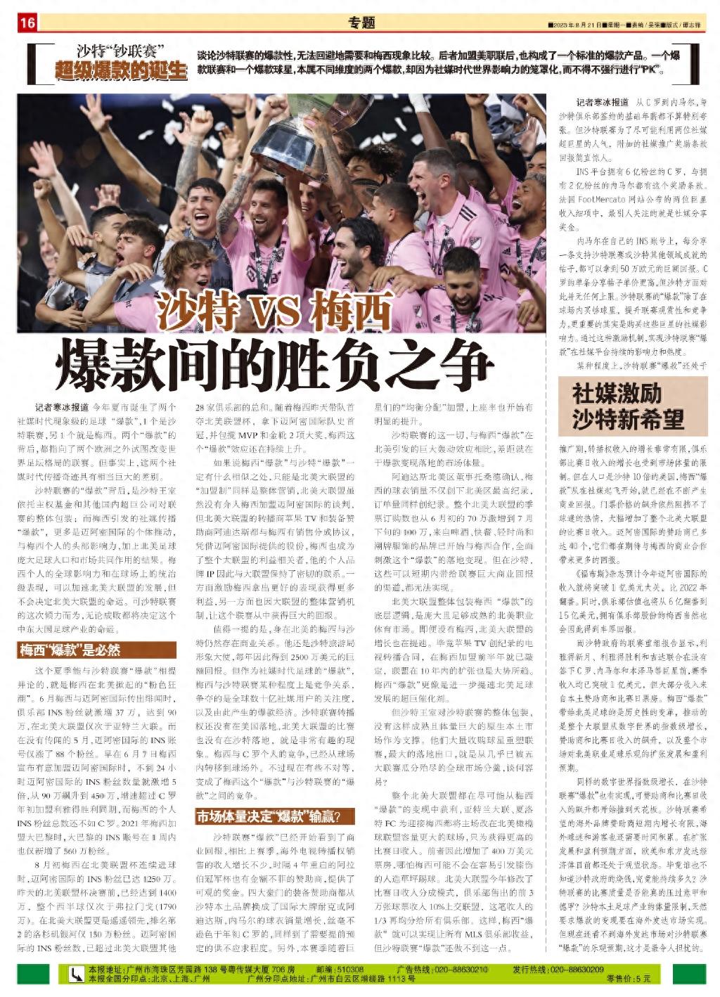 記者寒冰報道 今年夏市誕生了兩個社媒時代現象級的足球“爆款”,1個是沙特聯賽,另1個就是梅西。兩個“爆款”的背後,都指向了兩個歐洲之外試圖改變世界足壇格局的聯賽。但事實上,這兩個社媒時代傳播奇蹟具有相當巨大的差別。