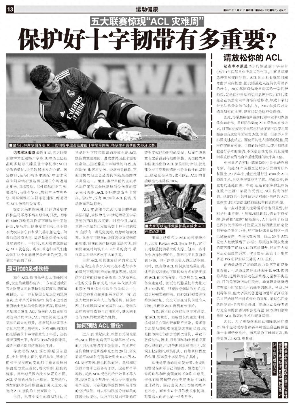 突如其來的傷病潮,已經迫使切爾西和皇馬不得不增加額外的引援。切爾西4500萬歐元高價簽下摩納哥中衛迪薩西,皇馬本已結束夏市引援,也不得不火線從切爾西租借門將凱帕應急。阿森納還沒有決定,是否緊急引援作爲廷貝爾的替補。一時間,五大聯賽球迷談起ACL就色變。現在,球迷和球員們也應該對這個足球世界最嚴重的傷勢,有更加全面的瞭解。