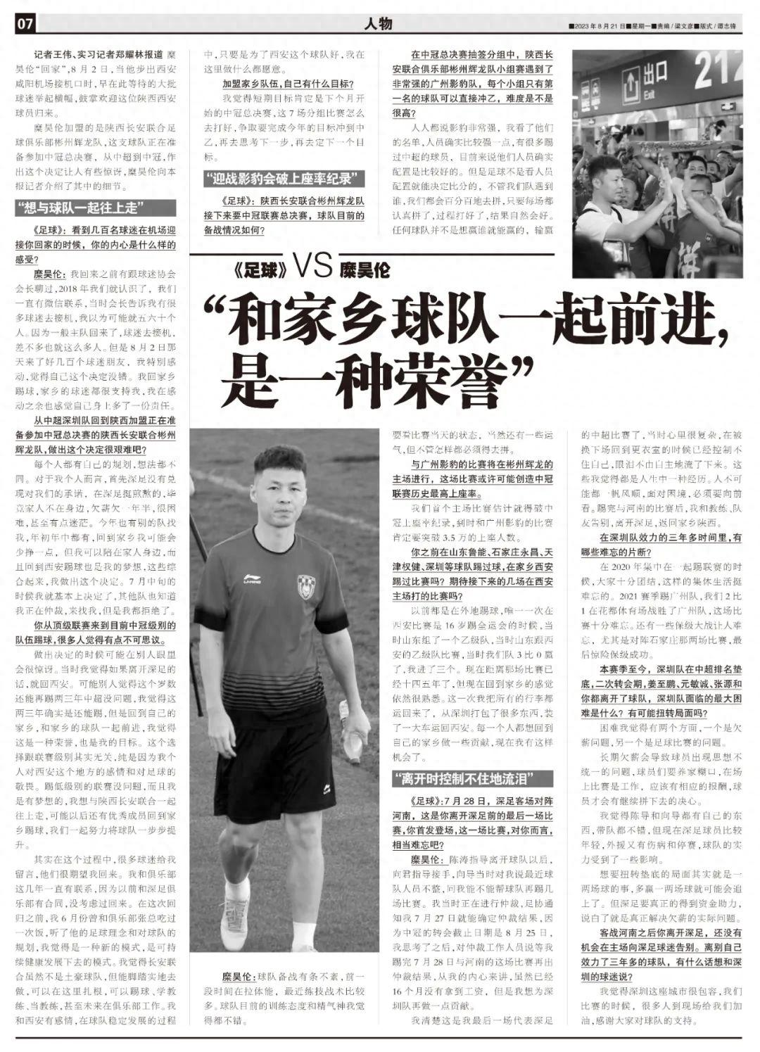 糜昊倫:陳濤指導離開球隊以後,向君指導接手,嚮導當時對我說最近球隊人員不整,問我能不能幫球隊再踢幾場比賽。我當時正在進行仲裁,足協通知我7月27日就能確定仲裁結果,因爲中冠的轉會截止日期是8月25日,我思考了之後,對仲裁工作人員說等我踢完7月28日與河南的這場比賽再出仲裁結果,從我的內心來講,雖然已經16個月沒有拿到工資,但是我想爲深圳隊再做一點貢獻。