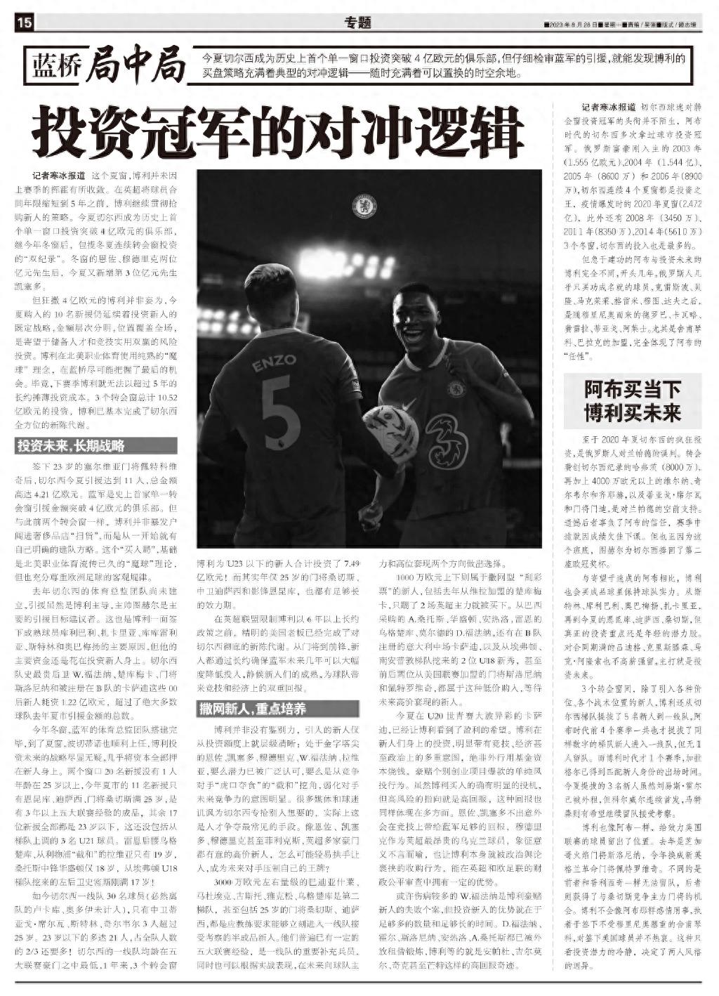 但狂撒4億歐元的博利並非妄爲,今夏購入的10名新援仍延續着投資新人的既定戰略,金額層次分明,位置覆蓋全場,是寄望於儲備人才和競技實用雙贏的風險投資。博利在北美職業體育使用純熟的“魔球”理念,在藍橋儘可能把握了最後的機會。畢竟,下賽季博利就無法以超過5年的長約攤薄投資成本。3個轉會窗總計10.52億歐元的投資,博利已基本完成了切爾西全方位的新陳代謝。