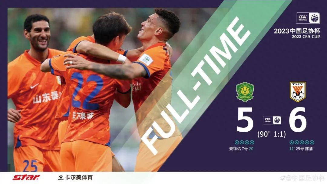 隨後是最殘酷的點球大戰,雙方前4名球員全部主罰命中,讓人驚訝的是,第5輪,國安隊進球功臣姜祥佑放了一腳高射炮,而泰山隊最後出場的費萊尼穩穩命中鎖定勝局,至此,山東泰山點球大戰中5比4獲勝,以總比分6比5淘汰北京國安晉級足協盃四強。
