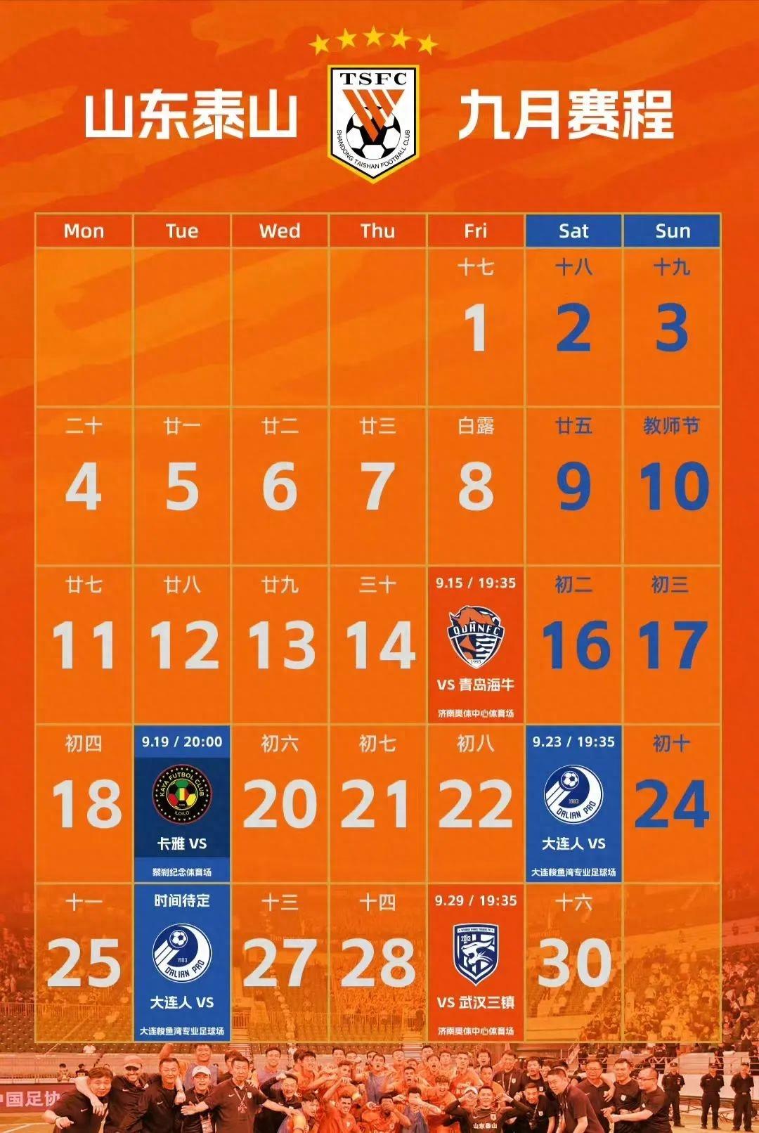 9到10月份6場比賽。12日之前,泰山的國家隊隊員和國奧隊隊員要參加國家隊和國奧隊的比賽,間隔時間14天;9月15日,中超第25輪,山東泰山主場對陣青島海牛;19日,亞冠小組賽第1輪,山東泰山客場對陣菲律賓卡雅;23日,中超第26輪,山東泰山客場對陣大連人;26日(待定),足協盃半決賽,山東泰山客場對陣大連人;29日,中超第27輪,山東泰山主場對陣武漢三鎮;10月3日,亞冠小組賽第2輪,山東泰山主場對陣橫濱水手。