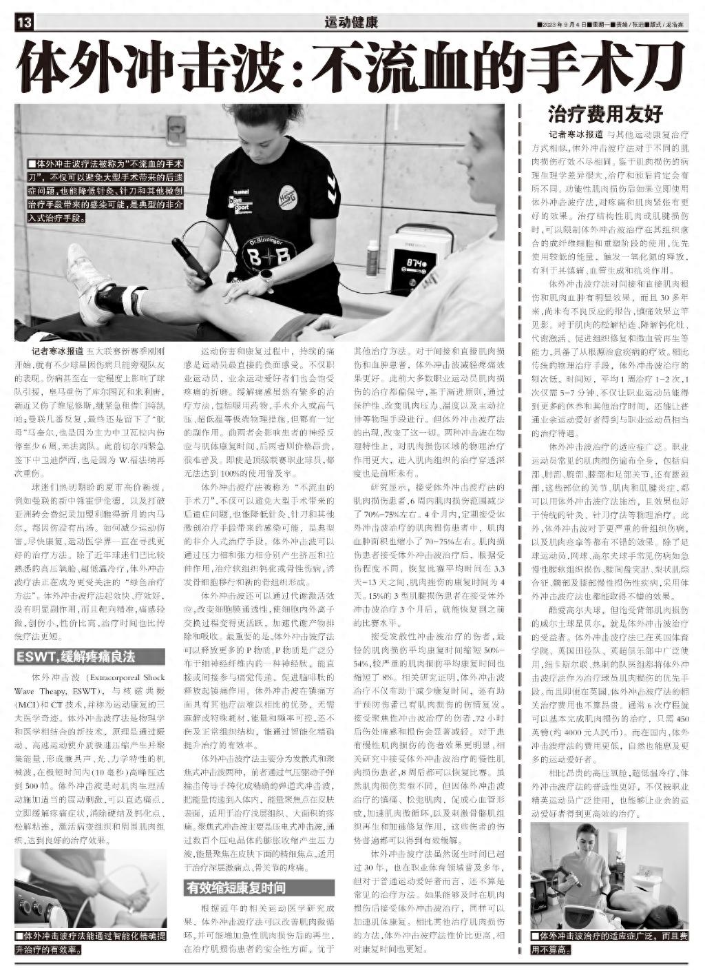 球迷們熱切期盼的夏市高價新援,例如曼聯的新中鋒霍伊倫德,以及打破亞洲轉會費紀錄加盟利雅得新月的內馬爾,都因傷沒有出場。如何減少運動傷害,儘快康復,運動醫學界一直在尋找更好的治療方法。除了近年球迷們已比較熟悉的高壓氧艙、超低溫冷療,體外衝擊波療法正在成爲更受關注的“綠色治療方法”。體外衝擊波療法起效快、療效好,沒有明顯副作用,而且靶向精準,痛感輕微,創傷小,性價比高,治療時間也比傳統療法更短。