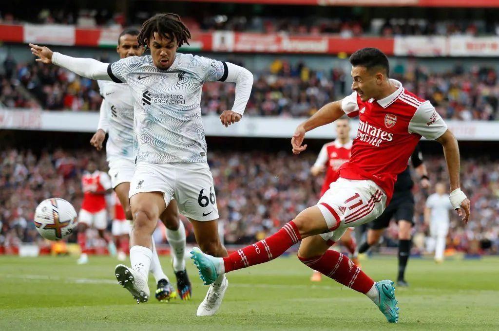 德比擊敗熱刺,和本輪對利物浦,阿森納都奔着搶開局備戰。這也是槍手本賽季最突出的特徵。熱刺固然輸在進攻上過分拘謹,最後一傳每每爛尾,但不妨追問:爲什麼熱刺會那麼驚慌失措?他們,以及本輪的利物浦,被阿森納旺盛的鬥志,渴望勝利的氣數所懾。開場1分鐘,馬丁內利繞到亞歷山大-阿諾德身後,開了一槍。