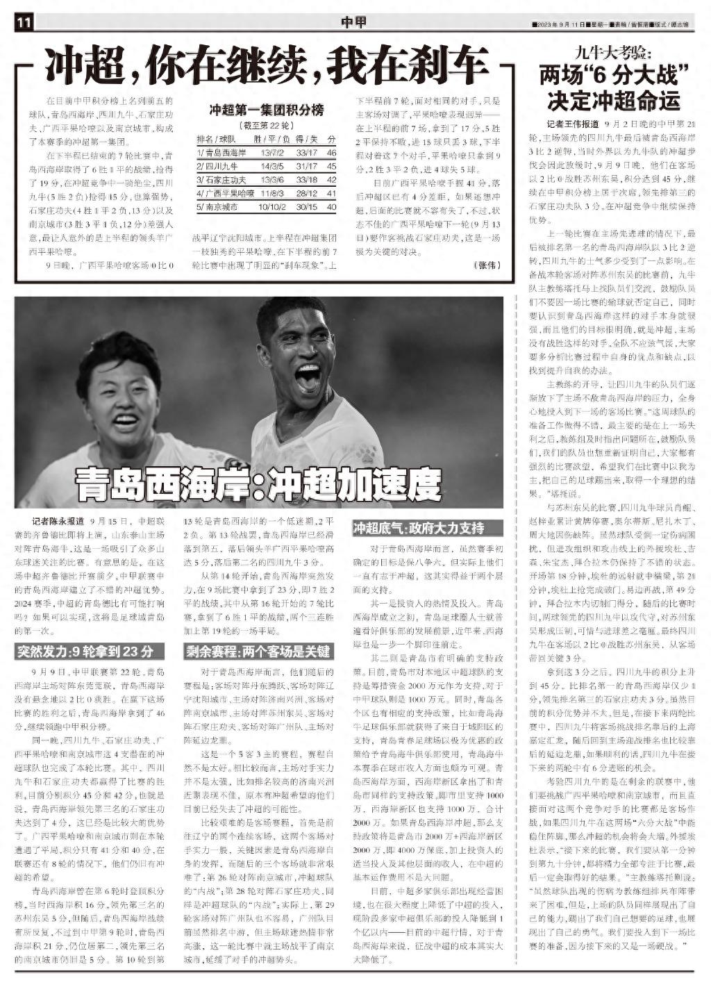 9月9日,中甲聯賽第22輪,青島西海岸主場對陣東莞莞聯,青島西海岸沒有懸念地以2比0獲勝。在贏下這場比賽的勝利之後,青島西海岸拿到了46分,繼續領跑中甲積分榜。