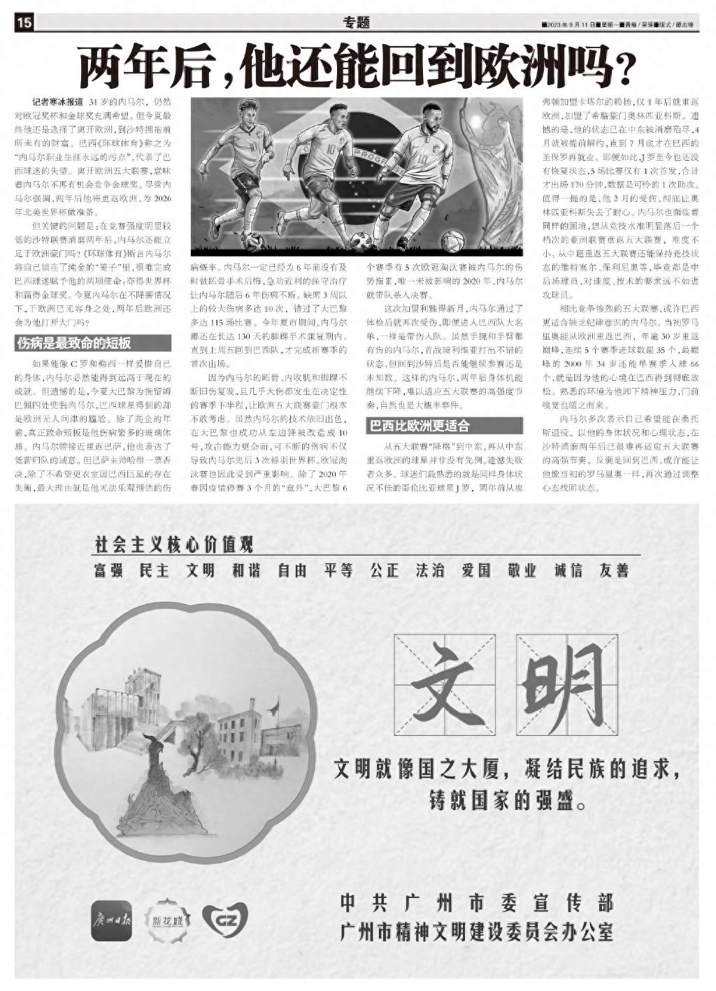 記者寒冰報道 31歲的內馬爾,仍然對歐冠獎盃和金球獎充滿希望。但今夏最終他還是選擇了離開歐洲,到沙特擁抱前所未有的財富。巴西《環球體育》稱之爲“內馬爾職業生涯永遠的污點”,代表了巴西球迷的失望。離開歐洲五大聯賽,意味着內馬爾不再有機會競爭金球獎。儘管內馬爾強調,兩年後他將重返歐洲,爲2026年北美世界盃做準備。