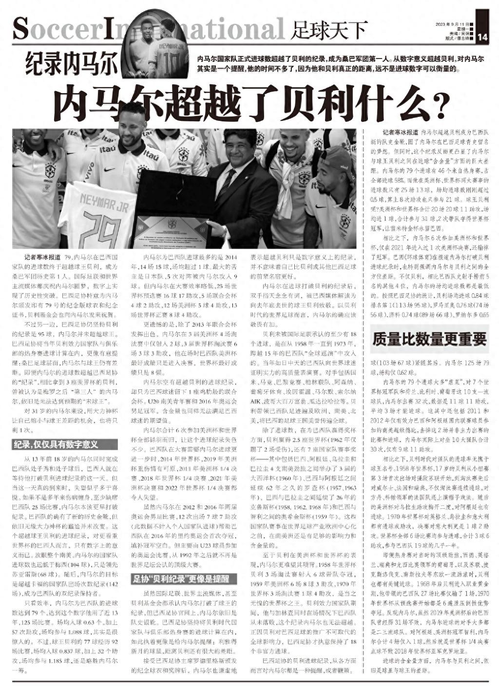 巴西足協的貝利進球紀錄,從各方面而言對內馬爾都是一種提醒,或者鞭策。