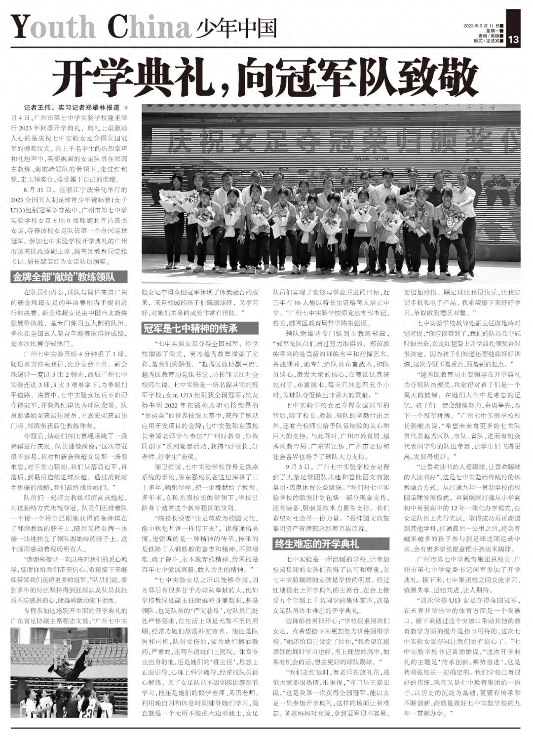 記者王偉、實習記者鄭耀林報道 9月4日,廣州市第七中學實驗學校隆重舉行2023年秋季開學典禮,典禮上最激動人心的是慶祝七中實驗女足奪得全國冠軍的頒獎儀式。在上千名學生的熱烈掌聲和禮炮聲中,英姿颯爽的女足隊員在鄭茵主教練、謝雄峙領隊的帶領下,走過紅地毯,走上領獎臺,接受屬於自己的榮耀。