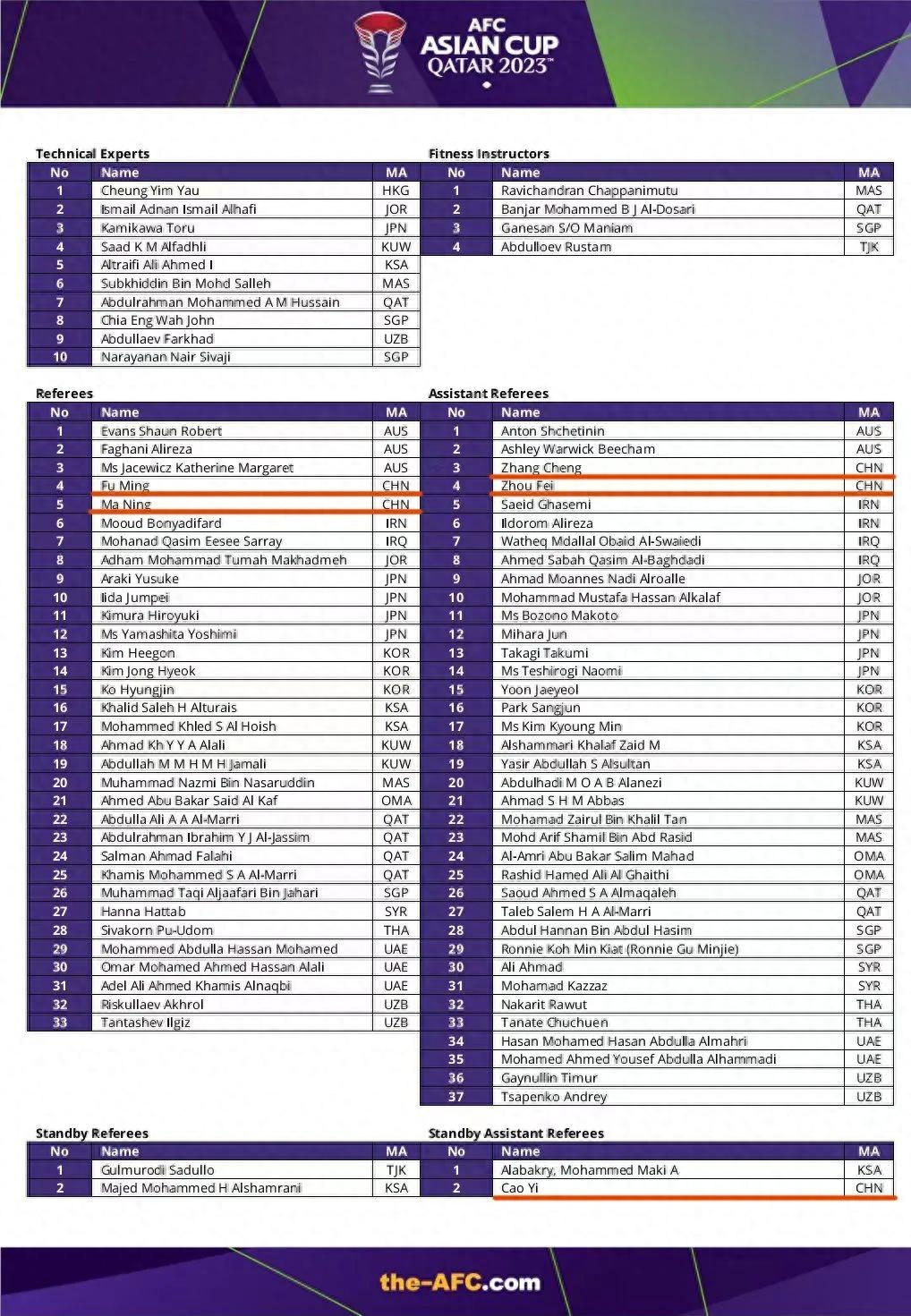 記者金錯報道 9月14日,亞足聯公佈了執法卡塔爾亞洲盃的74名裁判名單,馬寧、傅明以主裁身份入選,張誠、周飛以助理裁判身份入選,而曹奕則在候補助理裁判名單中。