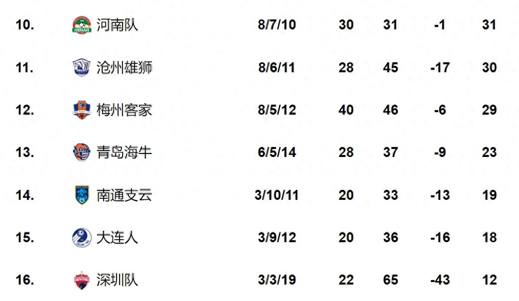 到目前爲止,深足在積分榜上以積12分墊底,25輪聯賽丟了65個球,失球率太過驚人,比少賽一輪排名倒數第三的南通支雲少7分,在聯賽還剩5輪的情況下,保級甚至可以說僅剩理論可能。
