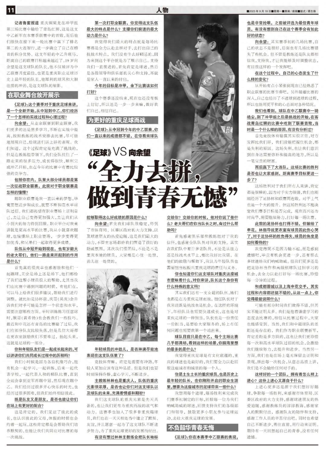 而在這支年輕的中乙升班馬陣中,還有着一位同樣年輕得令人驚訝的隊長——尚未年滿20歲的向餘望。這位重慶職業足球歷史上最年輕的隊長,本賽季已經多次斬獲中乙月度最佳青年球員。在接受本報獨家專訪時,向餘望直言希望將這份喜悅,送給一直以來給予球隊極大支持的重慶球迷,“今天看到很多球迷都流下了眼淚,我也忍不住熱淚盈眶。謝謝他們,我們一定不負期望,繼續努力,回報他們的支持!”