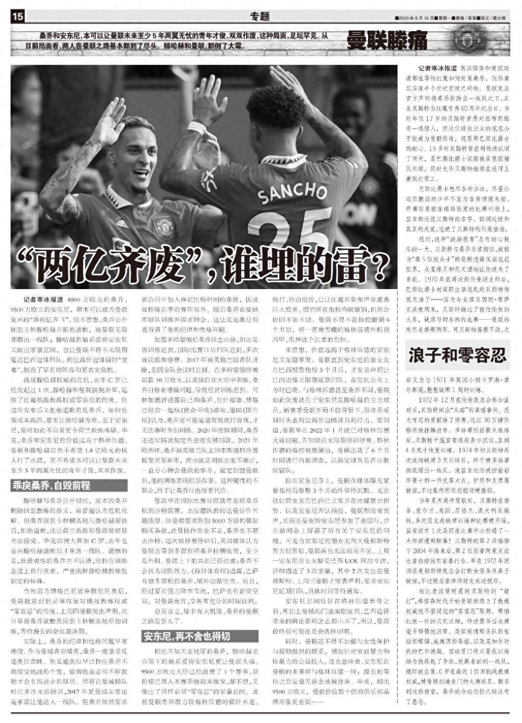 記者寒冰報道 8500萬歐元的桑喬,9500萬歐元的安東尼,原本可以成爲曼聯復興的“準兩億齊飛”。但不曾想,桑喬公開回懟主帥滕哈赫並拒絕道歉,被曼聯無限期踢出一線隊;滕哈赫的嫡系愛將安東尼又鬧出家暴醜聞,也讓曼聯不得不無限期延遲巴西邊鋒歸隊。兩位高價邊鋒同時“發難”,製造了罕有的陣容和更衣室危機。