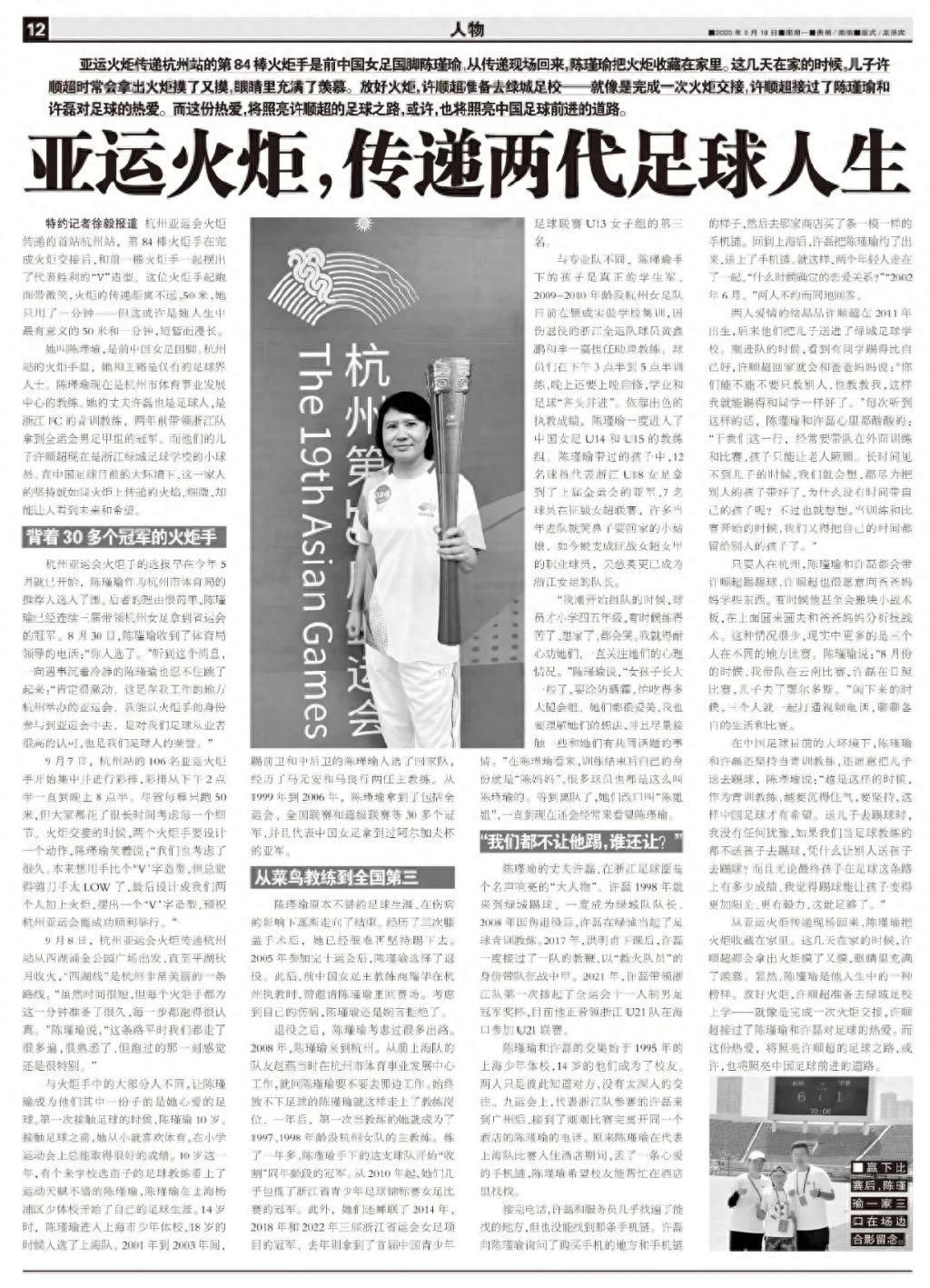 從亞運火炬傳遞現場回來,陳瑾瑜把火炬收藏在家裏。這幾天在家的時候,許順超都會拿出火炬摸了又摸,眼睛裏充滿了羨慕。顯然,陳瑾瑜是他人生中的一種榜樣。放好火炬,許順超準備去綠城足校上學——就像是完成一次火炬交接,許順超接過了陳瑾瑜和許磊對足球的熱愛。而這份熱愛,將照亮許順超的足球之路,或許,也將照亮中國足球前進的道路。