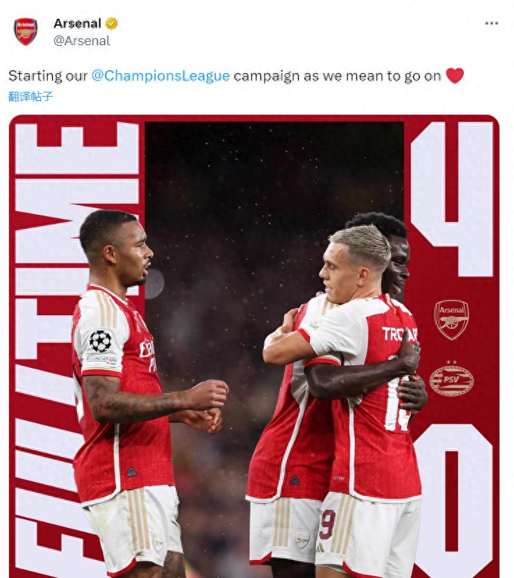 B組第一輪,薩卡、特羅薩德分別傳射建功,熱蘇斯和厄德高各進一球,阿森納時隔7年迴歸歐冠的第一場比賽,便在主場4-0血洗埃因霍溫。