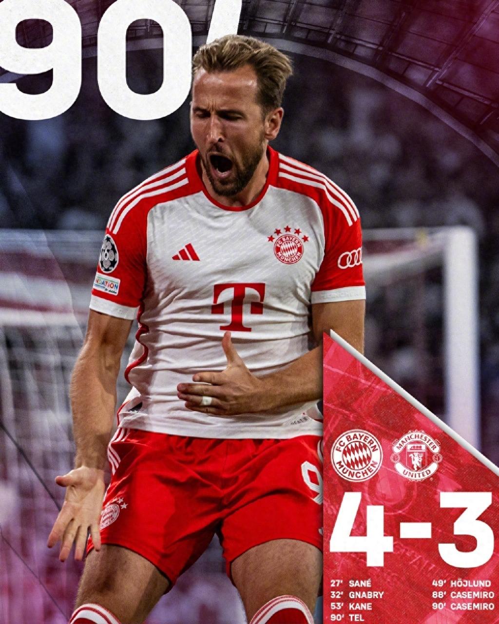 A組第一輪,凱恩傳射,卡塞米羅梅開二度難救主,最終拜仁主場4-3險勝曼聯。在補時階段,雙方還在對飈進球,最後打出了一場7+的大比分。