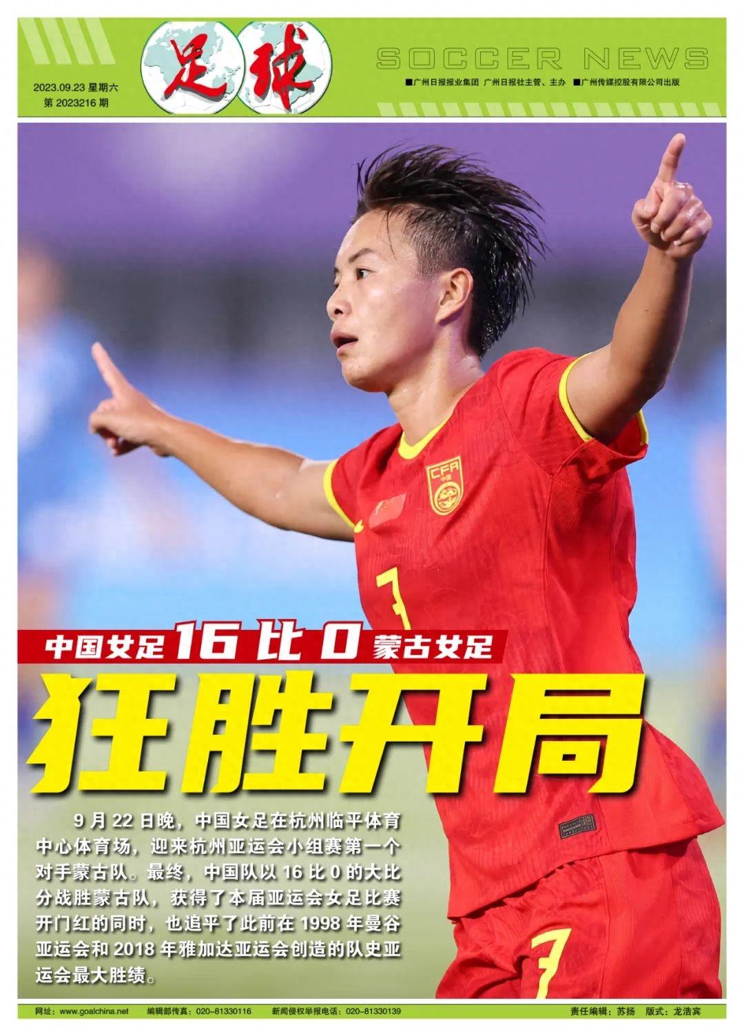 記者王偉報道 9月22日晚,中國女足在杭州臨平體育中心體育場,迎來杭州亞運會小組賽第一個對手蒙古隊。最終,中國隊以16比0的大比分戰勝蒙古隊,獲得了本屆亞運會女足比賽開門紅的同時,也追平了此前在1998年曼谷亞運會和2018年雅加達亞運會創造的隊史亞運會最大勝績。