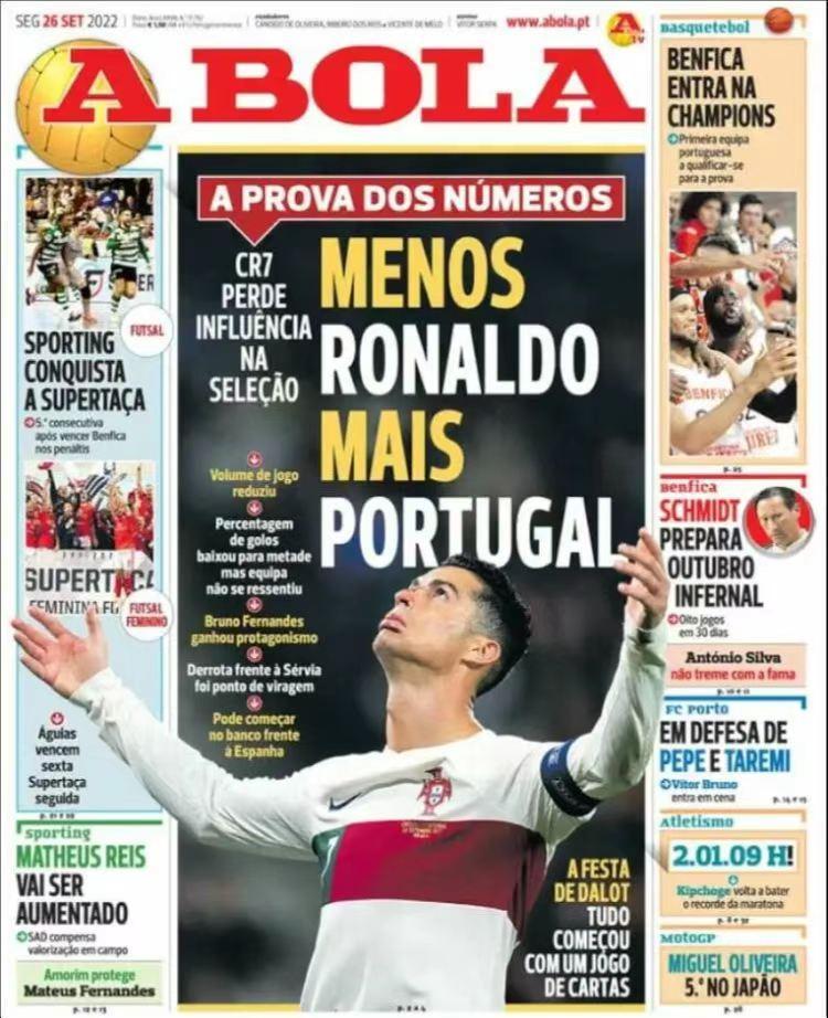 9月底的歐國聯小組賽,葡萄牙與西班牙爭奪歐國聯決賽圈資格的關鍵比賽之前,葡萄牙《球報》(《A Bola》)就已打出題爲《少一點C羅,多一點葡萄牙》的封面,呼籲讓狀態不佳的C羅替補,給更多年輕人機會。但最終桑托斯教練還是讓C羅首發,遺憾曼聯球星的表現一如既往地令人失望,而且10個月內第2次在主場輸掉關鍵比賽後扔掉隊長袖標。去年11月,葡萄牙主場輸給塞爾維亞未能直接出線後,他已經扔過一次隊長袖標,引發葡萄牙媒體和球迷的激烈批評。